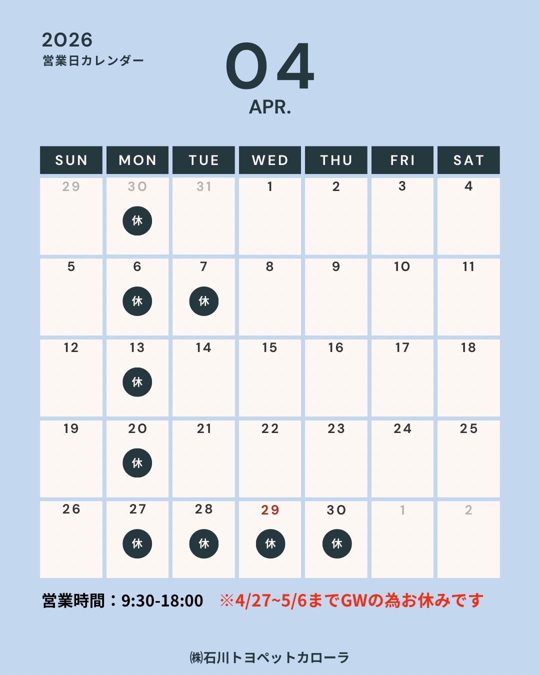 4月27日(月)~5月6日(水)までGW休暇でお休みとなります